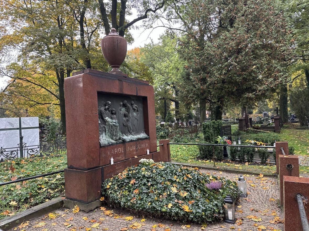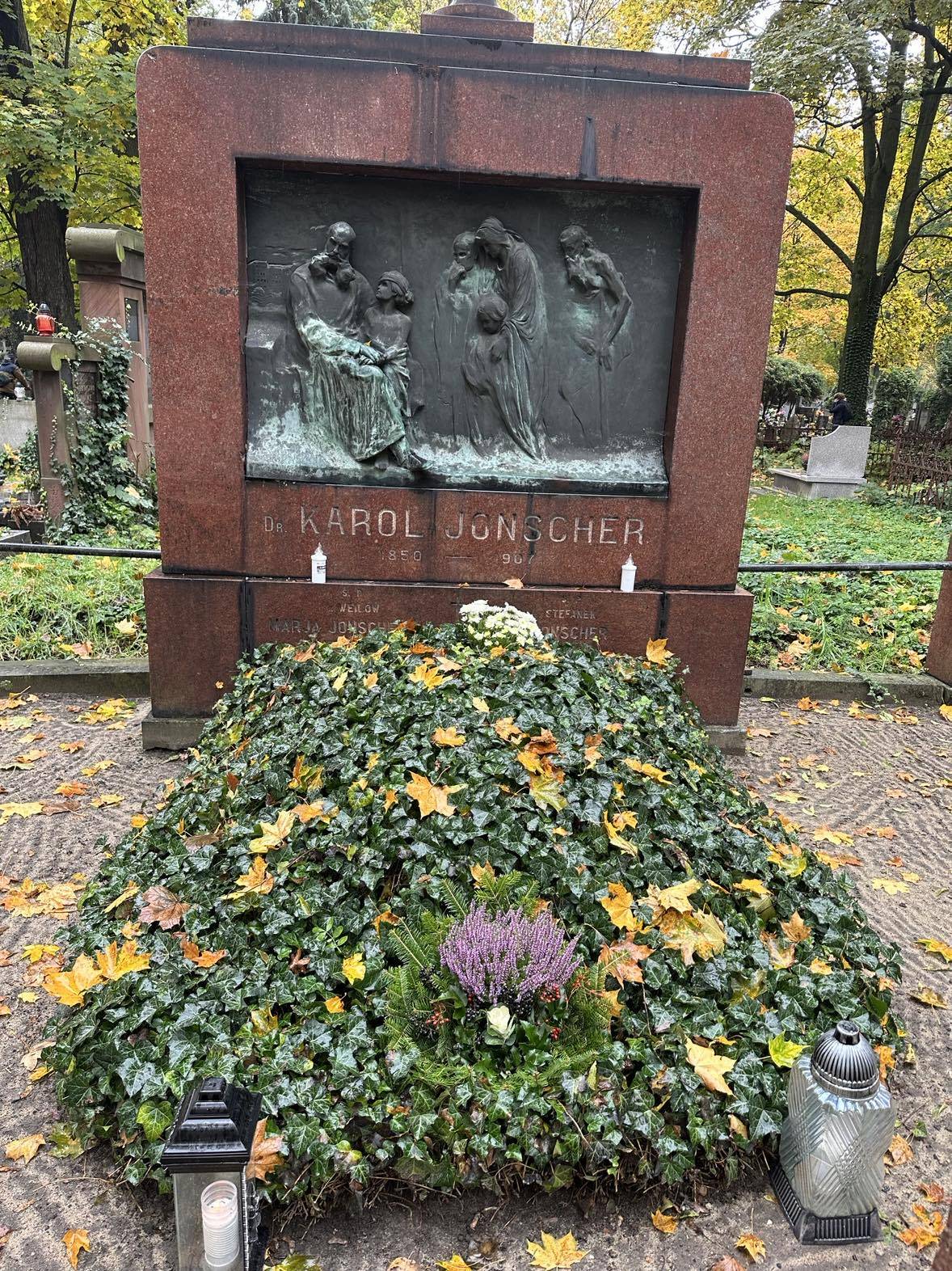 Na Cmentarzu Starym w Łodzi przy ul. Ogrodowej (wejście od strony części ewangelickiej) znajduje się pomnik dr Karola Jonschera. Dzisiaj z okazji Święta Zmarłych złożyliśmy tam wiązankę kwiatów i zapaliliśmy znicze. Ten piękny pomnik znajduje się przy głównej alei po prawej stronie. Na fotografii załączonej obok widać go w całej okazałości. Grobem naszego patrona opiekuje się na co dzień rodzina dr Jonschera. Nasza prośba jeśli odwiedzicie Państwo Cmentarz Stary zapalcie znicz na pomniku patrona Centrum.