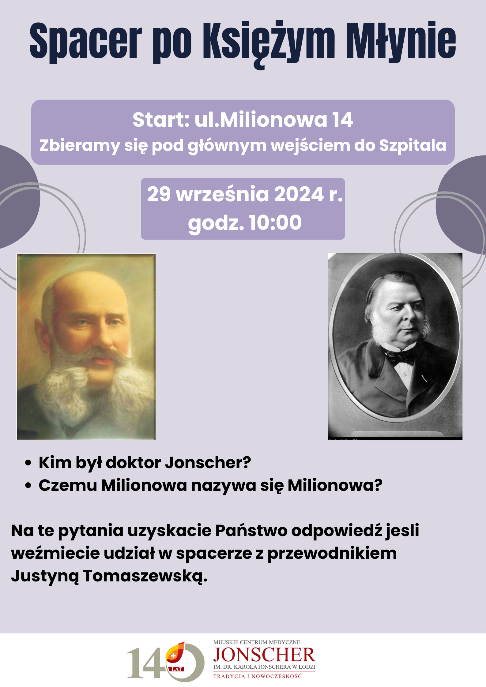 Zanim jednak rozpoczniemy piknik, zapraszamy na spacer po Księżym Młynie, który rozpocznie się o godzinie 10:00. Spotykamy się przed głównym wejścia do Szpitala im. dr. Karola Jonschera w Łodzi przy ul. Milionowej 14.