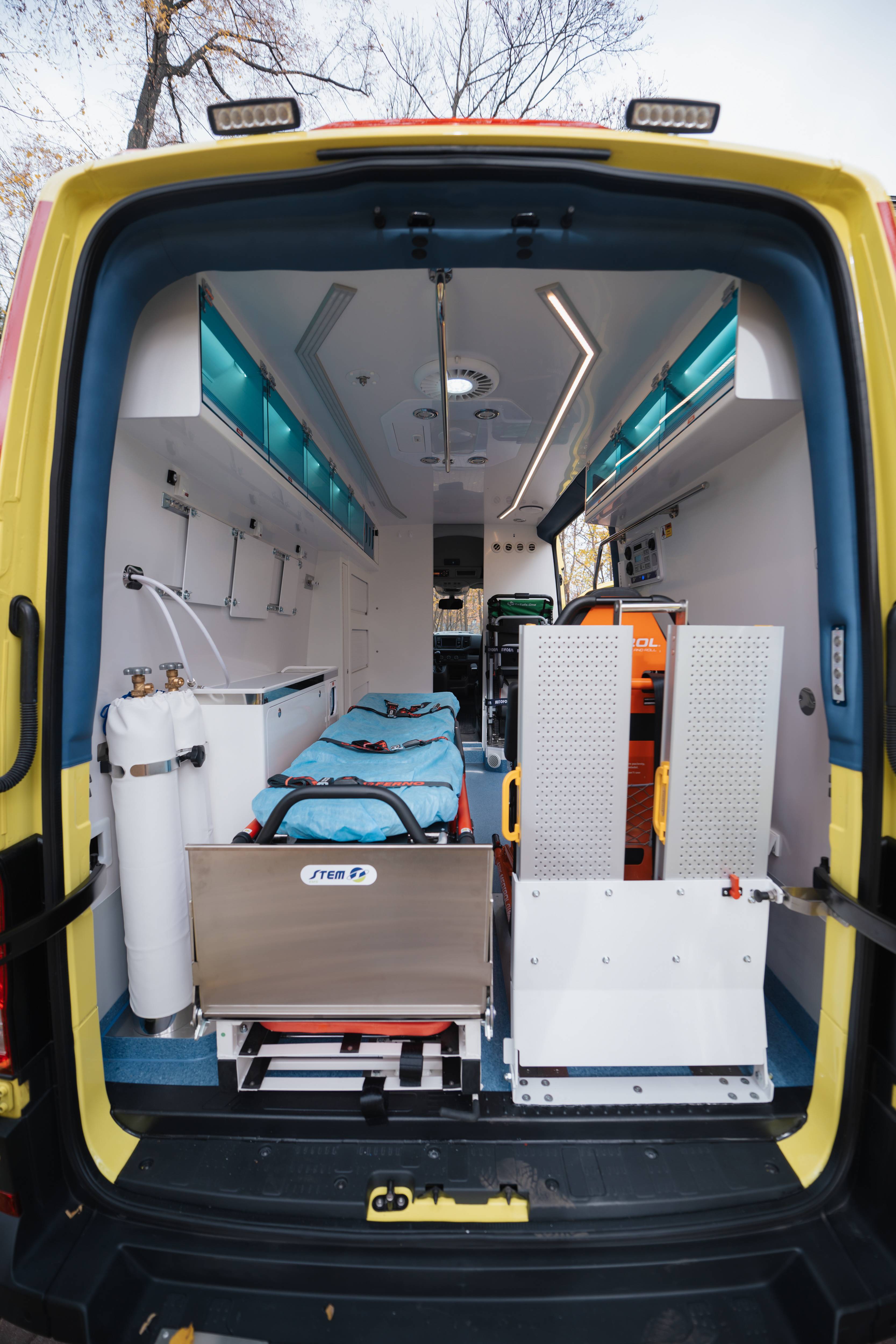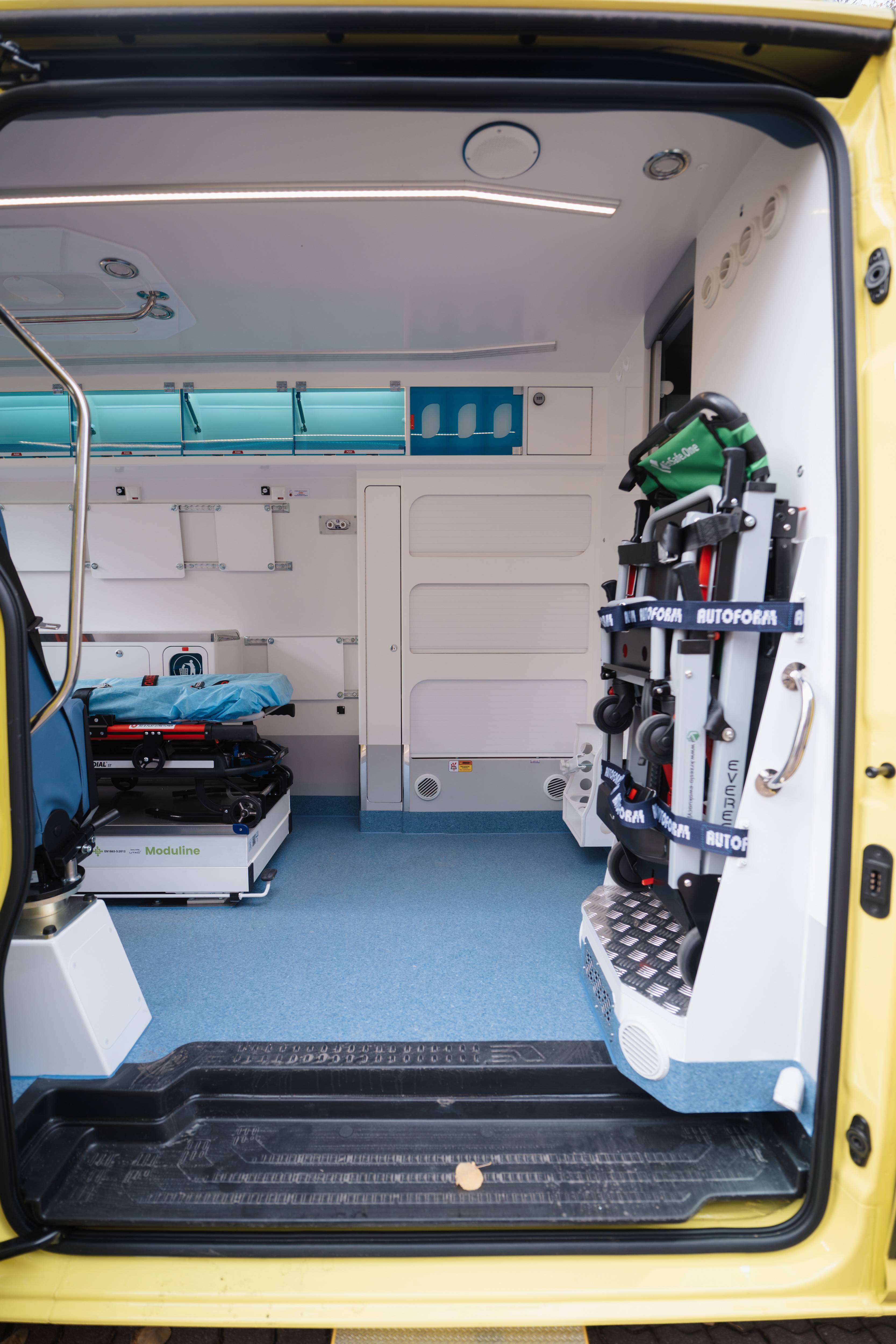 W ramach wyposażenia ambulans posiada: zestaw transportowy czyli nosze, krzesło kardiologiczne, schodołaz oraz deskę ortopedyczną.